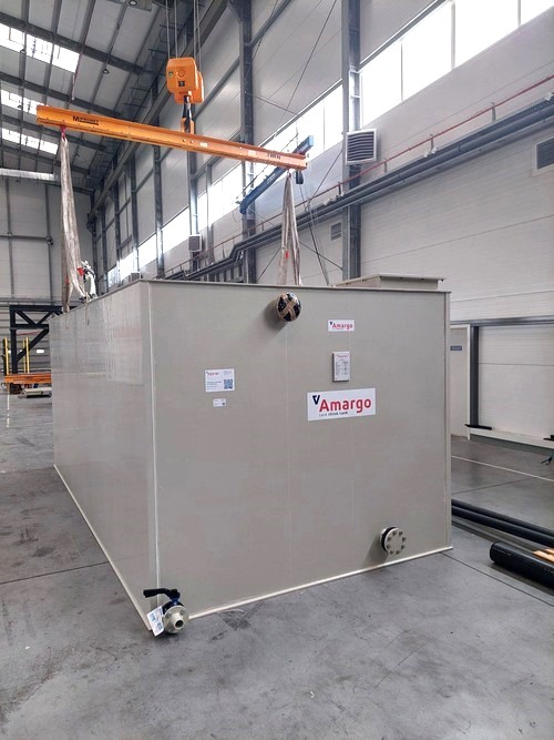 Zabudowany w kontenerze zbiornik panelowy AmargTank MultiPower® o dopuszczalnej pojemności użytkowej 25 m³ został wykonany z polipropylenu (PP), co gwarantuje odporność na korozję i wysoką trwałość przez dziesiątki lat.